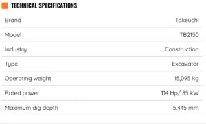 The TB2150R is the largest excavator in the Takeuchi line up. It features a fixed boom for greater stability and allows the operator to carry heavier loads. The TB2150R comes standard with a mono-boom that provides best in class digging depth (2-piece boom is optional). A 85 kW engine powers the TB2150R and it meets the very latest EU emissions standards. This engine also utilizes a DOC + SCR diesel exhaust after-treatment system. A redesigned operator’s station features a 7” color intuitive multi-informational display, radio with bluetooth capabilities, and an optional deluxe high back air suspension seat to keep the operator comfortable throughout the year. The TB2150R features a large wraparound counterweight, a rear view camera, and multiple LED working lights located on the boom, cab, and front cover. This machine has multiple auxiliary hydraulic circuits that makes it the perfect attachment platform that will provide the operator the power and durability needed to complete the toughest jobs.
