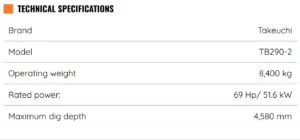 The Takeuchi TB290-2 8.4T Excavator has a wide array of features that maximize efficiency and productivity. A closed center,load sensing hydraulic system allows the TB290-2 to have outstanding multi-function capabilities, and the attachment presets greatly expands the machines versatility. The cabin on the Takeuchi TB290-2 Excavator is spacious and well appointed. A large color monitor keeps the operator informed of critical machine functions. The auxiliary flow rates can be adjusted from the operator’s seat.