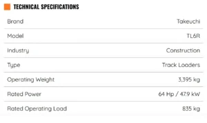 The Takeuchi TL6R Track Loader features a radial lift loader design and meets all current emission standards. With a height of 6 ft 5.8 in and a width of just over 5 ft the dimensions of the TL6R Track Loader allow it to excel on job sites that may have height and width restrictions. This Takeuchi track loader comes with a newly designed cabin with an overhead 5.7” color multi-informational display and backlit rocker switches that control a variety of machine functions. The Takeuchi TL6R comes standard with a quiet track design with flotation pads that reduces vibration, noise levels, and improves ride quality.